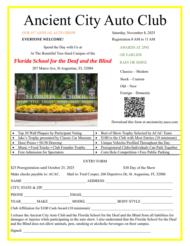 Ancient City Auto Club Show 8:00 am – 11:00 amNovember 8, 2025 Florida School for the Deaf & Blind207 San Marco AveSt. Augustine, FL 32084View LocationMap Florida School for the Deaf & Blind iCal Google Calendar View full calendar