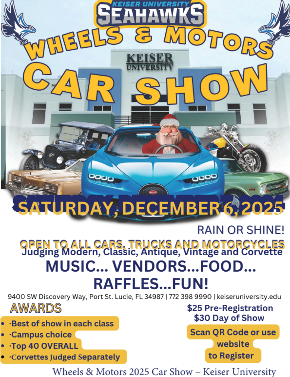 Wheels and Motors Car Show 8:00 am – 2:00 pmDecember 6, 2025 Keiser University9400 SW Discovery WayPort St. Lucie, Fl 34987772-342-5551View LocationMap Keiser University Click here for Online Registration --- https://forms.keiseruniversity.edu/psl-car-show/ iCal Google Calendar View full calendar